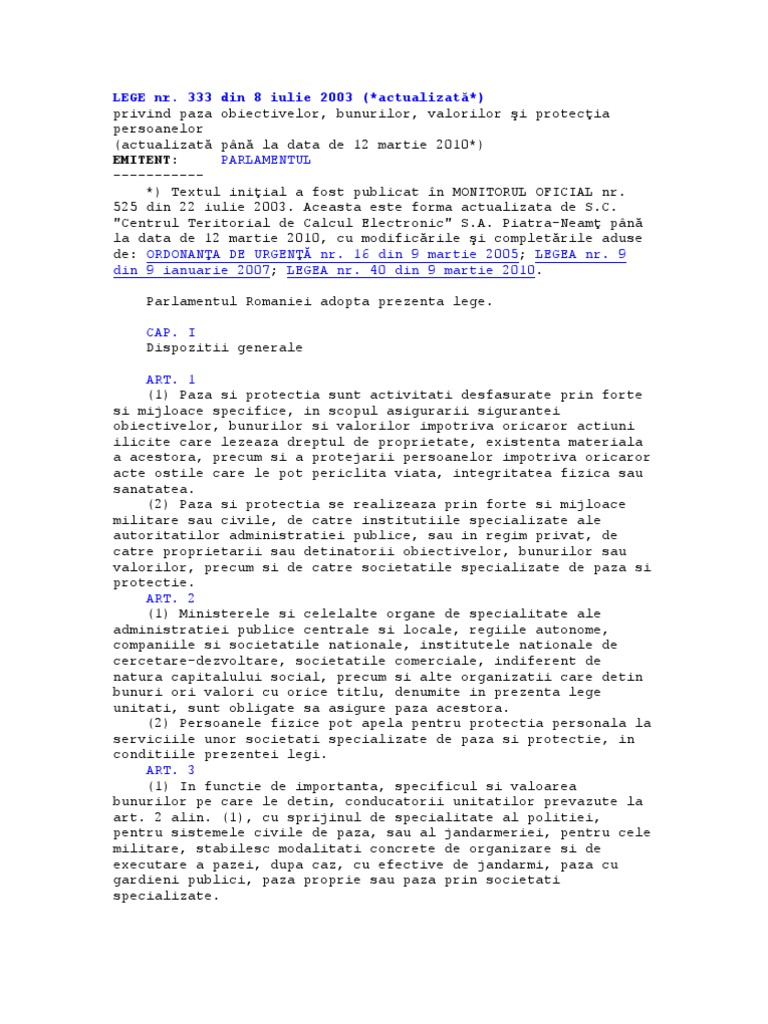 Lege Nr 333 Din 8 Iulie 2003 Actualizată Privind Paza Obiectivelor Bunurilor Valorilor Si Protecţia Persoanelor Actua